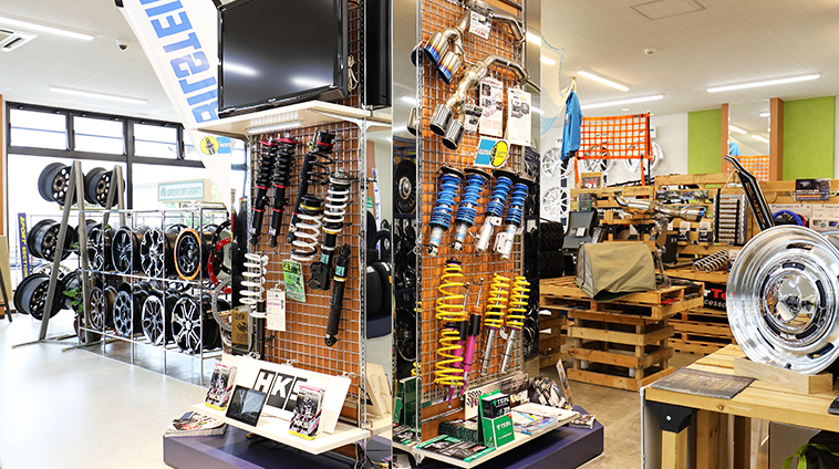 フラッグシップ店舗ならではの売り場面積と豊富な商品ラインアップが魅力的な当店。サゲ・アゲ・インポートカーと幅広い車種のお客様からご用命を頂いております。3Dアライメントテスターやエアコンガスクリーニングといった最新技術のマシンも完備済み。お客様の快適なカーライフをサポートさせて頂きます。